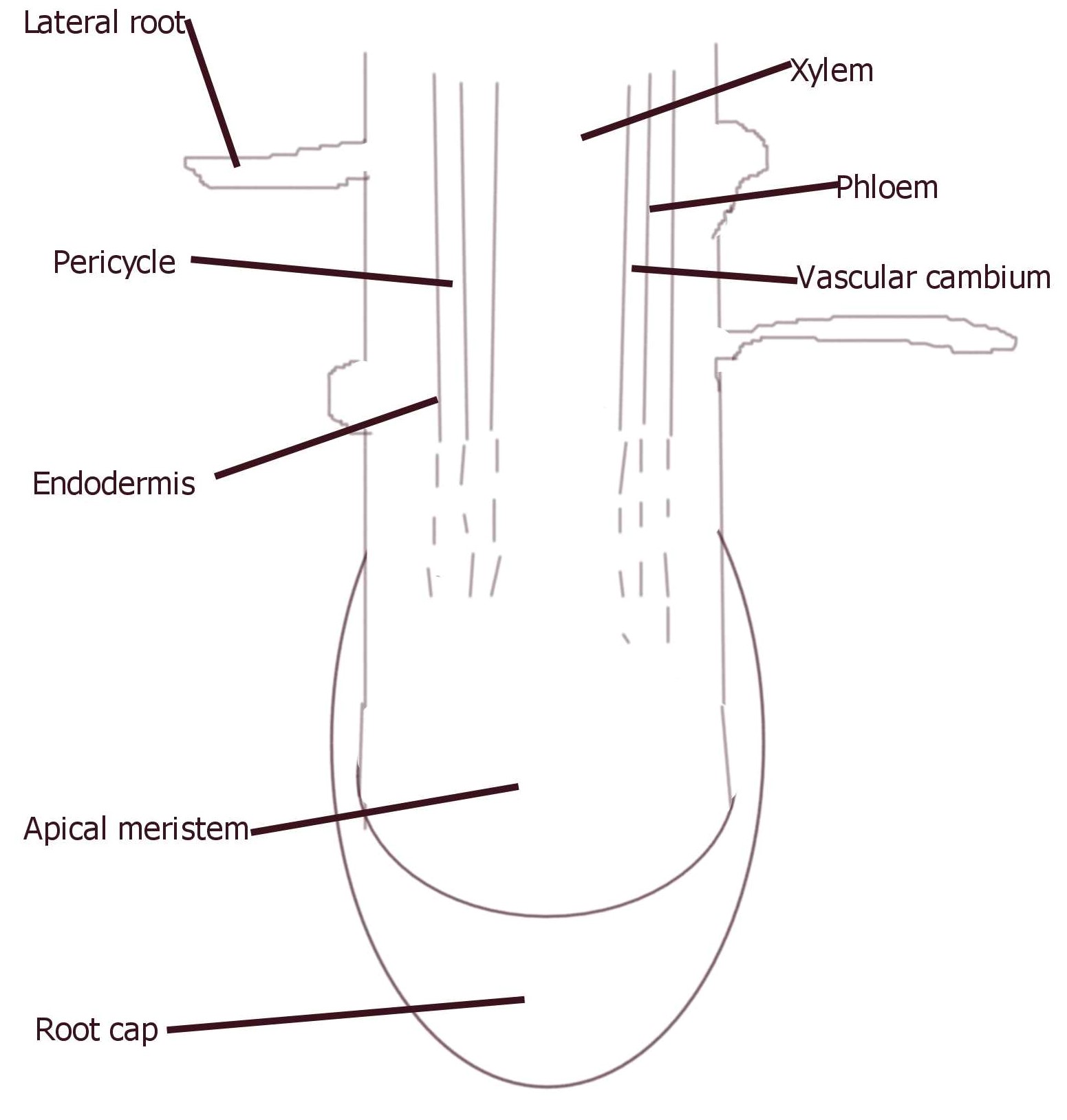 The diagram above is an attempt to show a length-wise cross-section of a root. I don’t think that this appeared in any of the past papers, but that could just mean that it is due soon! The area from the top to the endodermis label is the Zone of Cell Differentiation, as the cells have become part of particular tissues or specialised. The area with the dotted lines is the Zone of Cell Elongation. The area at the end where the Apical Meristem label is pointing is the Zone of Cell Division, where the cells actually divide and the root grows. The root cap is a protective layer to protect the growing root tip.