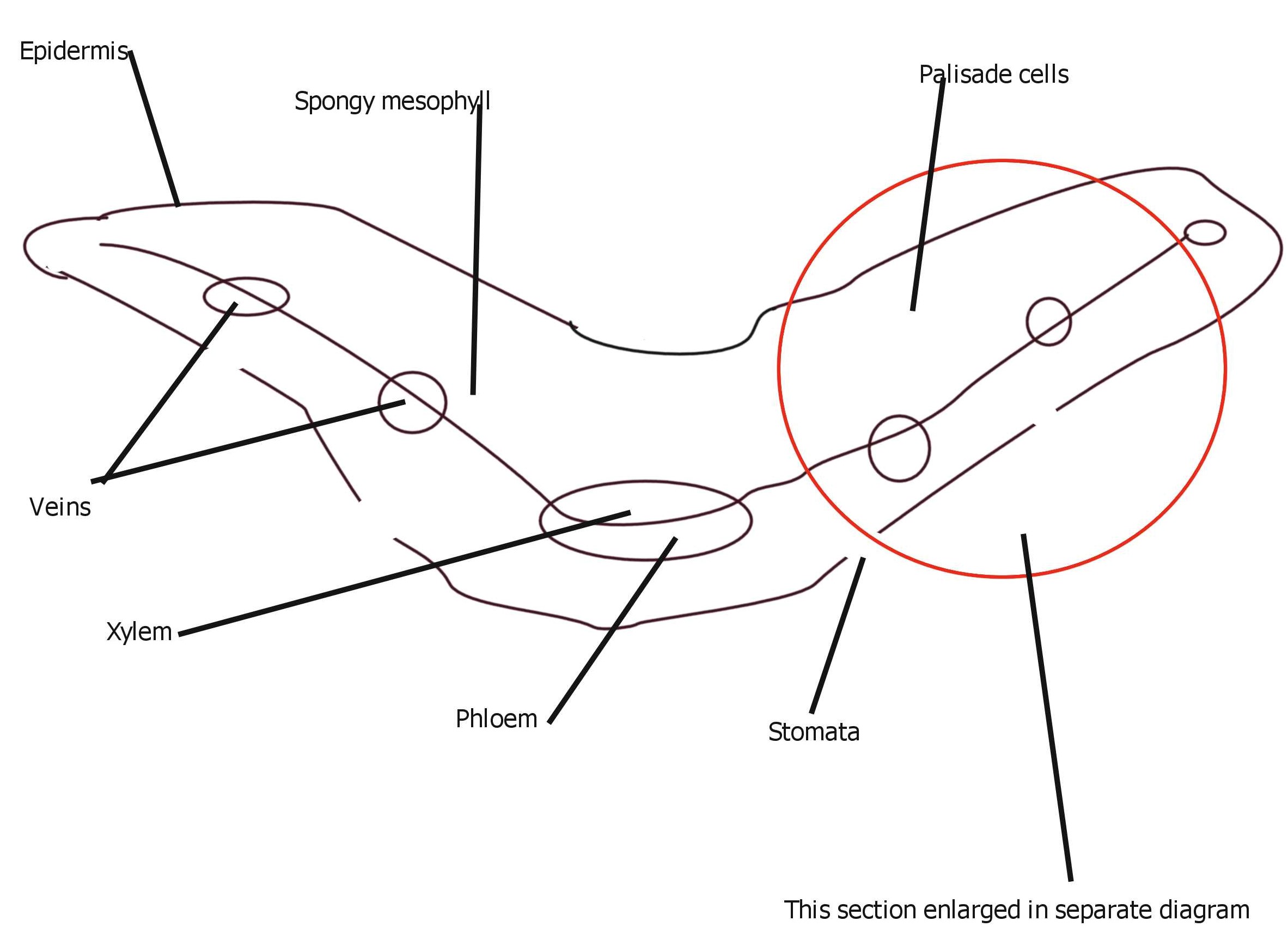 A question asking for a drawing of a leaf cross-section has come up before. The model answers did not show the drawing the examiners wanted, but did list out the parts they wanted labelled. I have not been able to find anywhere a diagram showing all of the parts they wanted so have given 2 diagrams above which have all the parts they wanted. If you could draw well enough, you could probably show both in one diagram but I thought it would be clearer as two.