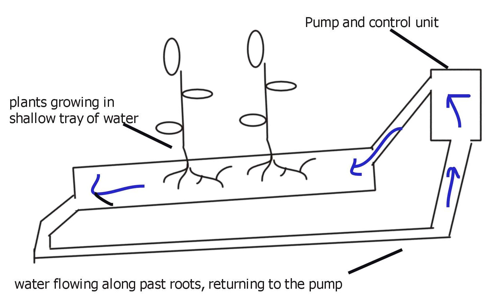 Nutrient Film Technique = a shallow tray is filled with the nutrient water and it flows along the tray. The plants grow with their roots in the shallow tray. The nutrient water is collected at the bottom of the tray, monitored for nutrient level and pH, aerated and then pumped back to the top of the tray to pass along the roots of the plants. This is good for water recycling, but can mean build up of disease in the water.
