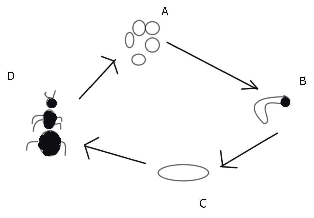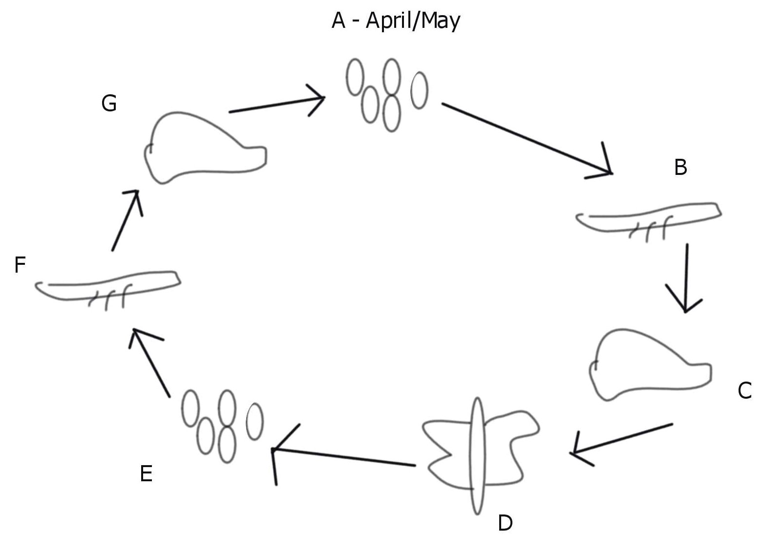 - D – in the autumn, winged males are produced, as well as some winged females. These can fly off to find each other and mate. The eggs are laid in a host tree to start point A again.