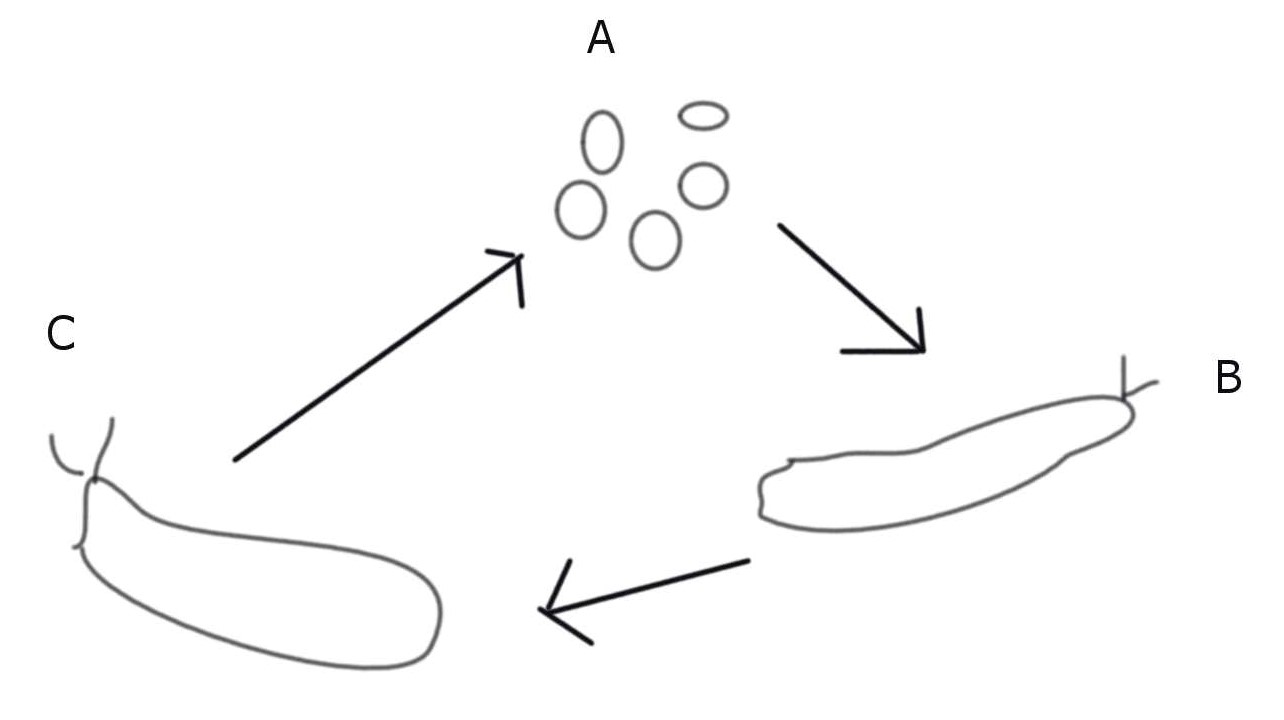 - B – The nematodes are stimulated by exudates from the root of the plant and make their way to the potato plant. The nematodes feed on the roots using a spear-like mouth which they use to suck out cell contents. Once mature, the male and female nematodes wriggle to the outside of the root to mate. The female leaves her head in the root though. The female’s body swells up and forms the cyst with the eggs developing inside her.